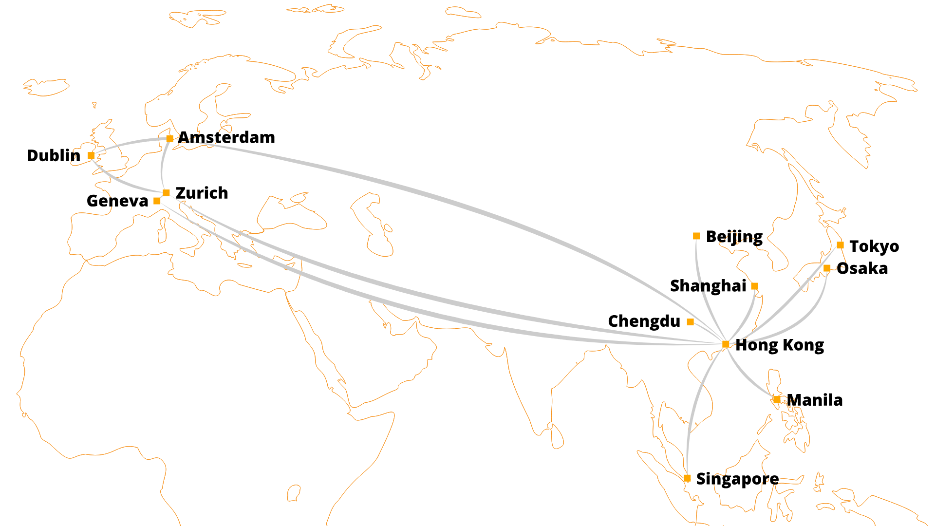 Our Points of Presences (PoPs) include Hong Kong and Singapore in Asia. In Europe, we are represented in Zurich, Amsterdam and Dublin.